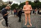 (明報19日訊)共和黨總統候選人川普的裸體塑像週四詭異地出現在曼哈頓聯合廣場。塑像上除了川普標誌性的髮型以外,一絲不掛,顯而易見,他很缺乏男子氣概。川普裸體塑像出現後立即引起極大轟動,很多市民一擁而上,去拍照或錄像。