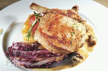 牛仔扒配菊苣及合桃、摩利菌汁——以Treviso Radicchio作配菜,加入香醋煎成,帶有醋香,菜本身的水分揮發了,苦味更濃。牛仔扒煮後再煎,入口即化。(圖:香港明報)