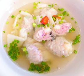 豬肉碎、鮮蝦加上芫茜、黑木耳和青蔥,乒乓球似的鼓鼓滿滿的水餃,1碗5粒,也足以讓一些胃口不大的人吃得飽足。若嫌不夠飽,可以添加粉。 (圖:大馬星洲日報)