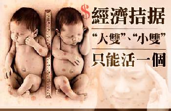 重慶一對雙胞胎兄弟因早產而發育不良,全身更感染真菌,但經濟拮据的父母只夠錢救治其中一個。由於弟弟的情況更為嚴重,即使治癒亦很大機會患上後遺症,如果走投無路,將被父母放棄。
