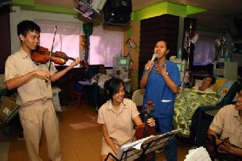 洗腎中心的護士和病人很快與學生打成一片。當學生奏起老歌時,護士有時也會拿起麥克風展歌喉。有個男病人知道學生要來,甚至還自備口琴,和他們大合奏。(大馬星洲日報)