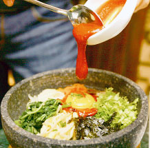 Dol Sot Bimbimbap 石鍋拌飯 這是我的最愛,是韓國眾多米食料理的代表作之一。石頭拌飯一端上桌那股氣勢,讓人忍不住想大快朵頤。炒豆芽、海苔、牛肉、各式各樣配菜和荷包蛋,很容易讓人遺忘白飯的存在。輕輕倒入醬料攪拌,醬料和蛋汁冒出誘人香氣和聲響,讓我頓時覺得自己像個魔術師,一個動作就把各具特色的食材,攪拌成合成一體的美味。