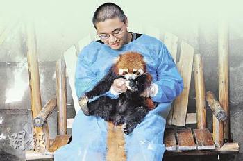 熊貓基地內還飼養了小熊貓,同樣可供抱抱拍照,費用便宜多了,100人民幣,也允許旁觀者參觀。(圖:香港明報)