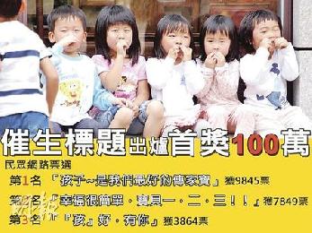 據報導,“鼓勵生育創意標語”共收到28,340則稿件,經網絡票選後,有關結果如下:“孩子——是我們最好的傳家寶”共獲9845票,位居第一;“幸福很簡單,寶貝一,二,三!”與“‘孩’好,有你”分列2、3名,各獲10萬與5萬元新台幣獎金。