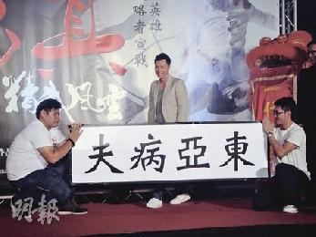 甄子丹被安排踢爛寫著“東亞病夫”字樣的牌,原來此牌是帆布製造,難怪“宇宙最強”也踢不爛。(圖:香港明報)