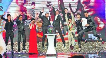 徐克率領一班《狄仁傑之通天帝國》演員出席於北京大學舉行的首映禮,各人更興奮地跳起,場面有趣。(圖:香港明報)