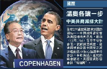 (丹麥)全球2大溫室氣體排放國的領袖——中國總理溫家寶與美國總統奧巴馬,週四(12月17日)在哥本哈根會面,就減排透明度、發達國援助發展中國家及減排幅度這3大核心議題舉行會談,爭取為陷入僵局的峰會破冰,美國官員形容會談“有進展”。但截至香港時間週五(12月18日)早晨1時,即峰會原定結束時間,談判未有最終成果,各國需“加時”談判。到週五早晨1時15分,溫家寶與奧巴馬第2度開會。