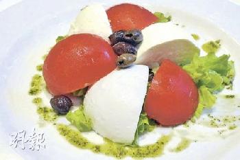創業於1899年的意大利米蘭老牌餐廳Ristorante Da Giannino的水牛奶芝士配番茄、橄欖和紫蘇葉醬汁,賣相十分簡單,可見意大利吃得很踏實。(圖:香港明報)