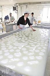 在水牛奶芝士廠內,芝士波輕鬆悠閒地浸在鹽水中,待芝士形狀更穩固。(圖:香港明報)