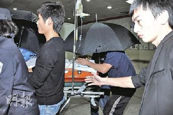在黑傘陣及毛巾重重保護下,Selina安全地被送往機場坐專機返台灣繼續醫治。(圖:香港明報)