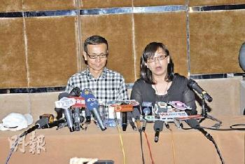 任爸爸與華研國際音樂總經理何燕玲(右)10月24日晚在上海舉行記者會,一方面在醫院亦安排運送女兒返回台灣治療。(圖:香港明報)