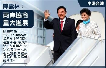 陳雲林今日(週一,12月21日)上午9時率領海協會代表團,搭乘中國國際航空公司福娃專機從北京首都機場啟程,中午12時23分降落台中清泉崗機場。陳雲林夫婦步出機艙後一路笑容滿面地向大家揮手、點頭致意,並未在機場發表任何談話,隨即搭上海基會特別準備,和台灣總統馬英九安全維護同檔級的平治防彈座車,直奔下榻的台中裕元花園酒店,並接受海基會董事長江丙坤的歡迎儀式。