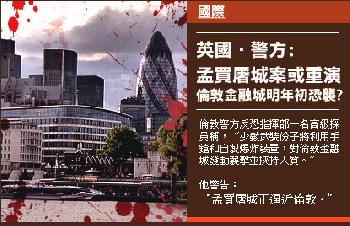 (英國)英國倫敦警方警告,有恐怖組織正密謀在明年初對倫敦金融城發動“孟買式”恐怖襲擊。