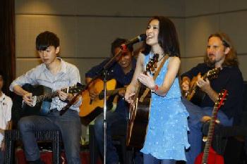 《Lee Guitars& Friends》記者會宛如一場音樂會,戴佩妮(右)和阿鑌等彈唱歌曲。(圖:馬來西亞光明日報)