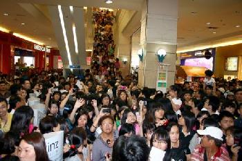 由於人潮太多,購物廣場索性停止操作舞台旁的手扶梯(Escalator),讓粉絲們有更多地方可站。現場只要購買美容套裝配套的朋友都可獲得佘詩曼玉照以上台索取簽名,結果排隊人龍長得看不見盡頭,所幸阿佘效率高,準準20分鐘內把名都簽完,然後趕赴機場。(圖:馬來西亞星洲日報)