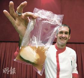 Mikel Arriet Arruiz這位原籍巴斯克的名廚,為香港西班牙商會炮製以火腿湯浸熟的鱈魚。(圖:香港明報)