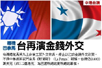 (台灣)台灣總統馬英九上台後主張外交休兵,停止以往的“支票簿外交”(即金錢外交)政策,不過中美洲國家巴拿馬《新聞報》(La Prensa)27日報導,台灣仍藉金錢外交的傳統做法,以4000萬美元(約3.12億港元)為巴國新總統更新總統專機。