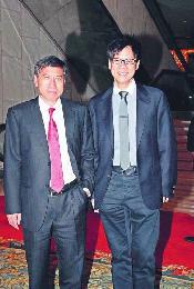 復職的無線業務總經理的陳志雲(右)與無線集團總經理李寶安11月25日晚一起出席頒發長期服務獎活動,兩人表現輕鬆也笑容自如。(圖:香港明報)
