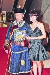 馬浚偉因趕戲關係,穿著古裝戲服出席領獎,身旁的楊怡稍露“事業線”。(圖:香港明報)