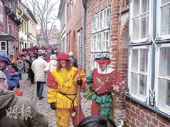 呂訥堡聖誕市集入口處有裝扮成守衛的人向遊客收取象徵式的入場費,其實不付費也可以直入市集。(圖:香港明報)