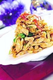 中式:蒜香海蜇拌火雞-火雞肉人手撕成絲,以味道較重的蒜和辣油提昇肉香,並以海蜇提昇口感。(圖:香港明報)
