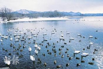 白天鵝和鴛鴦在冬天飛來北海道大沼國定公園過冬。(圖:香港明報)