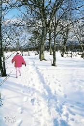 往回走不遠,往左轉進大沼湖濱的一道小徑,開始“島巡之旅”這道“主菜”。在夏天這是清風送爽的林蔭步道,山毛欅和水楢這兩種多葉樹把小島變成一個綠色森林。而此刻所有樹葉已枯落,林蔭是沒有了,路面上卻因訪客寥寥而鋪著厚厚的積雪,化成了一條“白雪之路”,令我等南方來客不禁雀躍萬分。