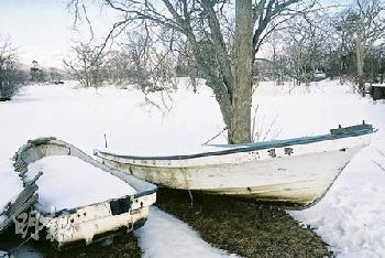擱在湖岸的小舟恍如冰面上的擺設。(圖:香港明報)