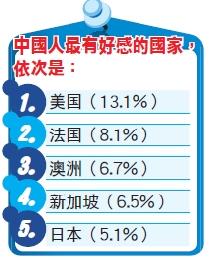 (中國)中國民眾對西方諸國多有批評,但一項調查顯示,中國人最喜歡的國家依序是美國、法國、澳洲、新加坡和日本。