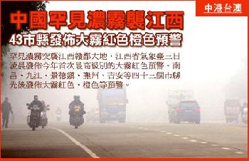 (中國)罕見濃霧突襲江西贛鄱大地,江西省氣象台1月3日淩晨發佈今年首次最高級別的大霧紅色預警。南昌、九江、景德鎮、撫州、吉安等43個市縣先後發佈大霧紅色、橙色等預警。