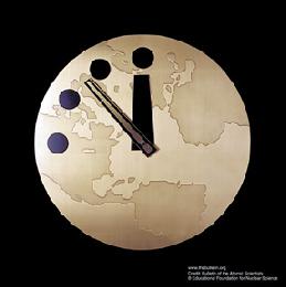 2007年1月17日,“末日之鐘”的分針被撥快2分鐘,距離子夜(核戰爆發)僅剩下5分鐘。末日之鐘(Doomsday Clock)是一面虛構的鐘,由美國芝加哥大學的《原子科學家公報》(Bulletin of the Atomic Scientists)雜誌於1947年設立。末日之鐘設立之初距離子夜有7分鐘,午夜零時象徵核戰爆發,雜誌委員會將根據世界局勢及爆發核戰的可能把分針撥近或撥離子夜,以此提醒各界正視問題。2007年1月13日,《原子科學家公報》宣佈會於2007年1月17日撥動時鐘,並首次將氣候轉變因素納入考量,因為雜誌委員會相信氣候轉變會助長核能應用。其中一個推測為氣候轉變將導致食水短缺,從而引發戰爭,由此間接增加使用核武的機會。“末日之鐘“最近一次調整在2010年1月14日,分針被撥近子夜1分鐘,距離子夜僅6分鐘。(資料來源:維基百科)