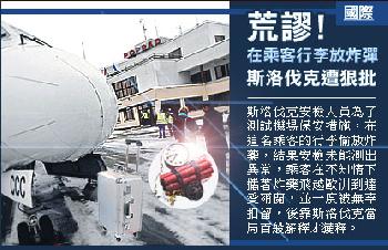 (斯洛伐克)東歐斯洛伐克一名飛機乘客成為該國反恐實驗品,並險被當作恐怖份子。安檢人員為了測試機場保安措施,在這名乘客的行李偷放炸藥,結果安檢未能測出異常,乘客在不知情下攜著炸藥飛越歐洲到達愛爾蘭,並一度被無辜扣留,後靠斯洛伐克當局百般解釋才獲釋。事件曝光令輿論嘩然,民眾紛紛質疑斯洛伐克當局的行為是否合法。