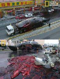 2004年1月26日,一具長17公尺、重50噸並略呈腐爛的抹香鯨屍,因內部蓄積過多腐敗氣體,在台灣台南市鬧區運載途中爆裂。周遭的商店、目擊者及車輛全被鯨魚的鮮血、內臟擊中,惡臭四溢。這只雄性抹香鯨是於雲林縣台西鄉海岸擱淺而死。相關單位出動平板卡車、3輛起重機及50位以上的人員,耗時13小時才得以將其裝運上車,以公路方式運送。國立成功大學王建平教授原先計劃將鯨魚運至位於台南市中心的成大,並解剖研究。但在校方拒絕後,決定轉移至市郊的四草野生動物保護區。運送時間挑定凌晨以減少對民眾的干擾,但鯨屍竟在台南市中心西門路小北夜市附近自體爆裂。由於鯨屍已爆裂,學者不得不放棄後續解剖計劃。1年後,王教授利用鯨魚遺體製作骨骼標本,2005年4月8日起在四草台江鯨豚館展示。(資料來源:維基百科)