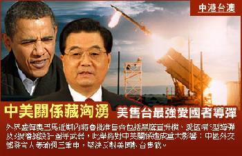 外界盛傳奧巴馬近期內將會批准售台包括黑鷹直升機、愛國者3型導彈及8艘潛艇設計圖等武器,此舉將對中美關係造成重大影響;美國前總統小布什2008年卸任前宣佈對台65億美元的軍售案,引發北京強烈不滿,剛起步的中美軍事對話與交流也一度停頓。