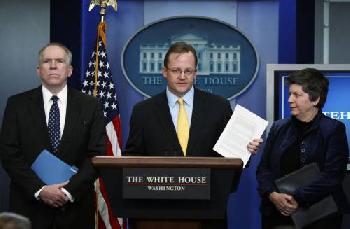 美國國土安全部長納波利塔諾(右)、白宮發言人吉布斯(中)和白宮反恐顧問布倫南,週四(1月7日)在白宮的新聞發佈會上,對聖誕節炸機未遂案調查報告發表講話。