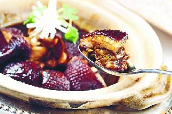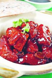 鎮江排骨煲 - 腩排以紅酒糟醃過、泡油,再以鎮江醋、冰糖等煮至起膠,醬汁包在腩排的外層,酸甜而香口。(圖:香港明報)