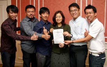 王賽芝(右3)和眾人手持由國家電影局頒發給電影《初戀紅豆冰》的“本地電影證書”。左起為詹賢恩、大馬中文電影促進會籌委會成員之一李家鋐及陳慶祥;右起:電影《Lelio婆婆》製片人姜志昂及導演兼《初戀紅豆冰》監製鄭建國。(圖:馬來西亞星洲日報)