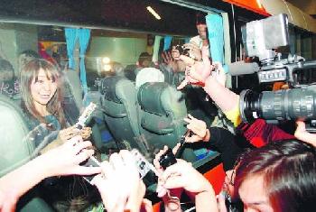 大島優子約9時晚步出機場,接機大堂早已聚集近百粉絲,還舉起多款不同紙牌。現場有7名保安維持秩序。大島優子現身時,粉絲一湧而上,她見狀被嚇一嚇,但隨即鎮定下來,並微笑跟粉絲打招呼,表現親切,身旁的工作人員則貼身保護她。