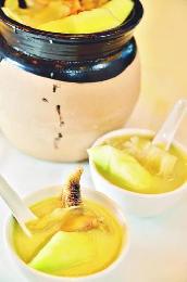 馳名爵士湯——美國蜜瓜帶著獨有果甜,配以花膠、螺頭瘦肉等材料,製成味道濃郁的老火湯。(圖:香港明報)