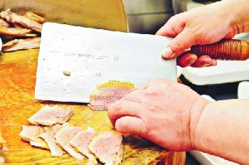 林師傅說,切鵝肉講技巧,鵝胸肉需切出40片才算及格,需以斜刀落,逆紋切將纖維切斷,入口鬆化,而賣相亦較直刀切為佳。(圖:香港明報)