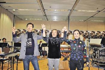 鄭少秋、喜多郎及汪明荃攜手辦音樂會,3月29日綵排更來個手牽手合照顯示默契。(圖:香港明報)