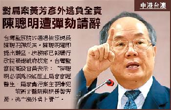 監察院一名高級官員表示:“陳聰明必須為沒能阻止扁家家庭醫生、扁家貪污案主要嫌犯――前新光醫院副院長黃芳彥,逃亡海外負上責任。”