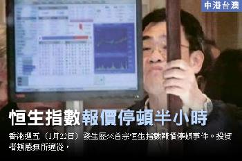 (香港)香港週五(1月22日)發生歷來首宗恒生指數報價停頓事件。恒指週五早上10時開出第一口價後,即中斷報價,H股指數等同樣停報,投資者頓感無所適從,中斷時間長達半小時。“靠指數定生死”的牛熊證產品最受牽連,產品發行商投訴有損失,投資者質疑市場混亂。負責編算及提供數據的恒生指數公司表示,中斷原因仍在調查中,應該是內部接收股份報價出現技術問題,不涉及黑客入侵等外來因素,公司為對公眾造成不便致歉。