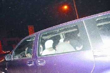 率先駛出拘留所用作調虎離山的公安車,車內有3名男子俯身避鏡頭,其中黑衣者(右)左耳掛上無線耳機,相信是用來互通消息之用。(圖:香港明報)