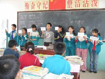 這是光永在陝西參與的青少年輔能計劃的學生,通過遊戲教導他們認識基本的英語生字。 (圖:馬來西亞星洲日報)