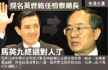 (台灣)馬英九決定提名法務部次長黃世銘接任台灣檢察總長,對此,民進黨團強調,黃世銘是適當的人選,國民黨立委邱毅也說,這是馬英九幾次提名中最正確的一次。不過邱毅也擔心,就是因為黃世銘太正直,不見得會得到立委支援。