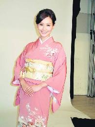 法拉穿上和服拍照,她表示原本有專人指導穿法,但對方沒到場,幸好自己曾到日本留學半年,學過穿和服,否則胡亂穿上招人笑柄。(香港明報)