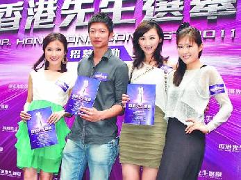 (香港)“香港先生”高鈞賢5月14日於銅鑼灣舉行的《香港先生選舉》招募活動上表演才藝,迷暈到來撐場的高海寧、劉倩婷、周家蔚。