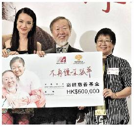 電影《不再讓你孤單》舉行慈善首映,為高錕慈善基金籌得50萬元善款,高錕伉儷親自接受善款支票。(圖:香港明報)