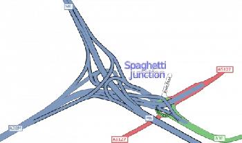 1972年5月24日,英國伯明翰附近的格瑞夫里山立交橋(Gravelly Hill Interchange)開通,為當時世界上最複雜的立交橋,暱稱“意大利麵條路口”(Spaghetti Junction)。格瑞夫里山立交橋,也被稱為M6公路6號路口,連結M6高速公路與A38高速公路。整個立交橋佔地面積達30英畝,共有18條車道,高架道路連同引橋共長4公里,由559根水泥柱支撐,離地面最高點達到24.4米。由於多條地方公路和鐵路線路也都從此橋區經過,使得整個路口看上去就像一盤意大利麵條。1970年代晚期,伯明翰當地一位報紙編輯將其戲稱為“意大利麵條路口”,不久這個暱稱流行全世界,成為此類複雜立交橋的通稱。格瑞夫里山立交橋由於密集了大量道路,在冷戰期間甚至有謠言稱其是蘇聯導彈的戰略目標;另外,由於其繁重的交通量而被數次維修。(資料來源:維基百科)